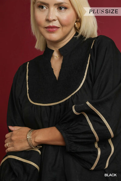 • Split V-neck with smocked yoke