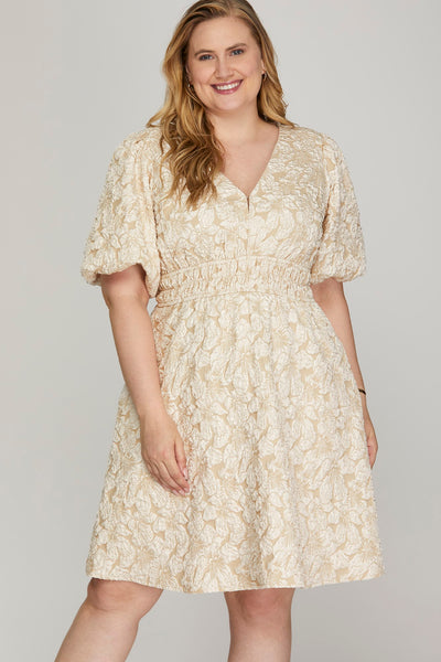 BALLOON SLEEVE PLUNGING NECK FLORAL PATTERN JACQUARD DRESS WITH ELASTIC WAIST BAND