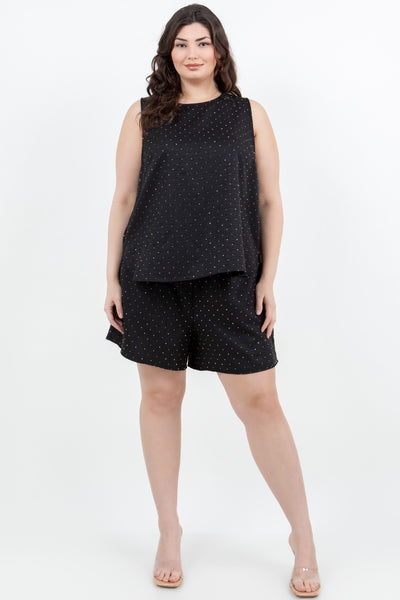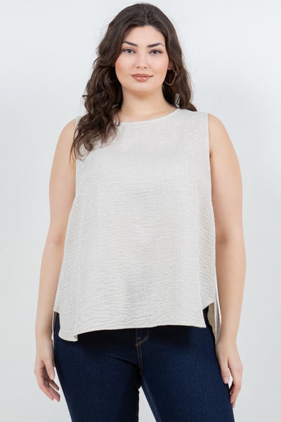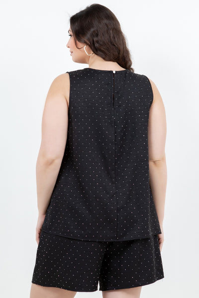 Solid Round neck, Hi-lo Tank top with hot fix detail and back button in a beautiful cape cod fabric. Plus Model: LAURA (bust: 41", waist: 34, Hips: 41") is 5'.8" wearing a 1XL