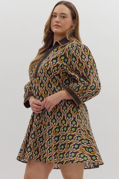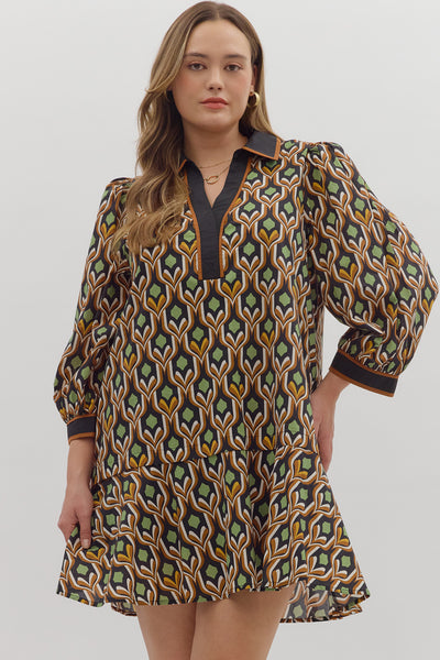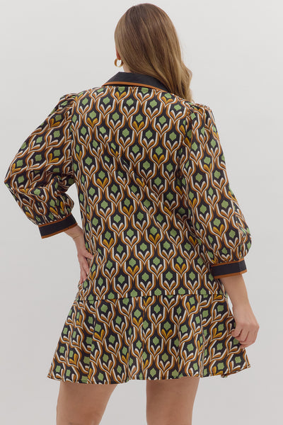 Geometric print long puff sleeve mini dress featuring contrast split V-neck with stand collar and ruffle hem. Pocket at side. Lined. Woven. Non-sheer. Lightweight