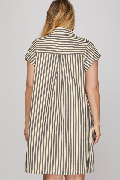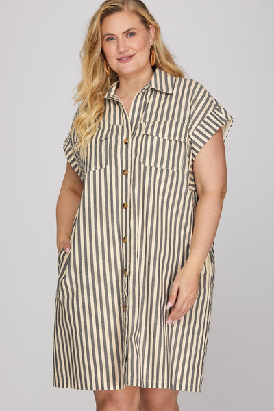 DROP SLEEVE WOVEN STRIPE COLLARED BUTTON DOWN MINI DRESS WITH LINING AND POCKETS