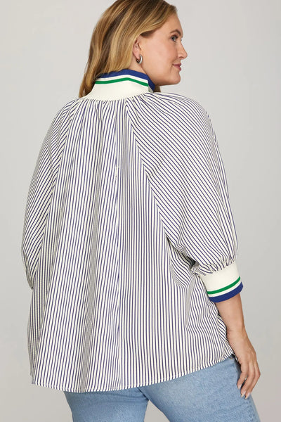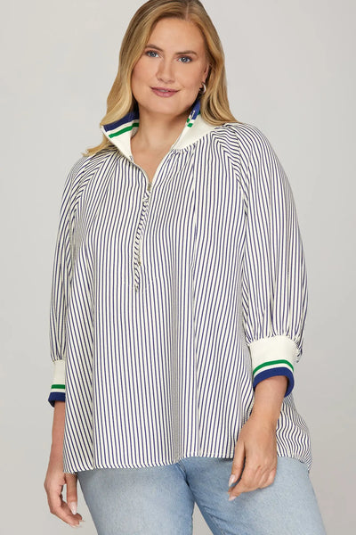 3/4 SLEEVE HALF ZIP STRIPED TOP