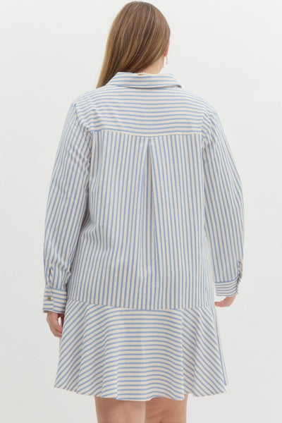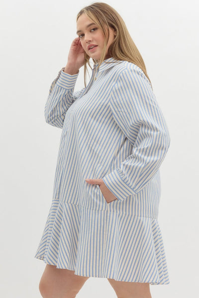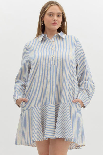 Striped long sleeve collared drop waist mini dress featuring button up detail at bust. Pockets at side. Lined. Woven. Non-sheer. Lightweight.