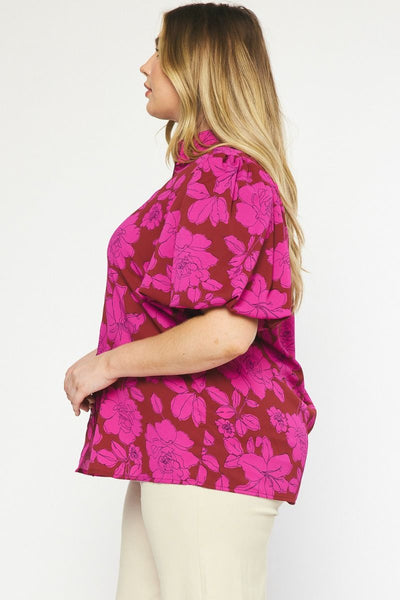 Floral print short sleeve button-up top featuring puff sleeves. Unlined. Woven. Non-sheer. Lightweight.