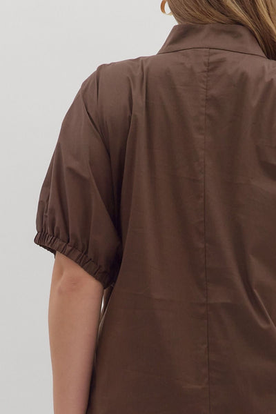 Solid short puff sleeve midi dress featuring band collar with V-neckline. Elasticated sleeve opening. Side pockets. Side slits. Lined. Woven. Non-sheer. Lightweight.