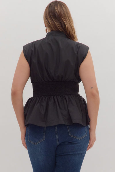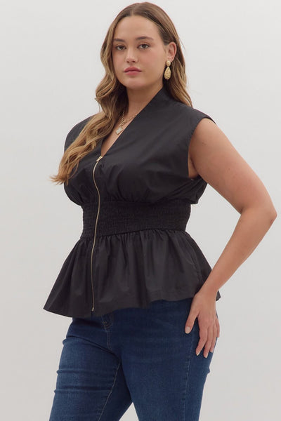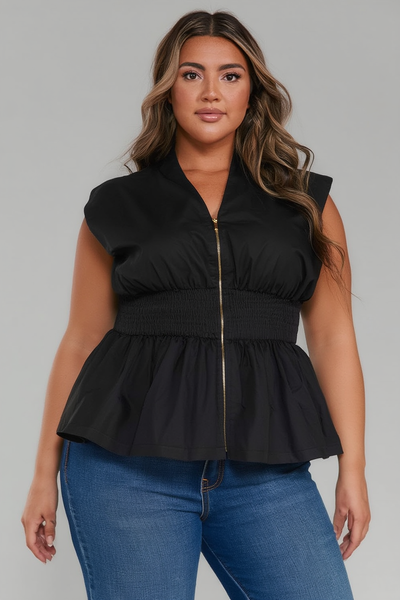 Solid sleeveless top featuring wide smocked waist with peplum hem. Zipper closure at front. Unlined. Woven. Non-sheer. Lightweight.